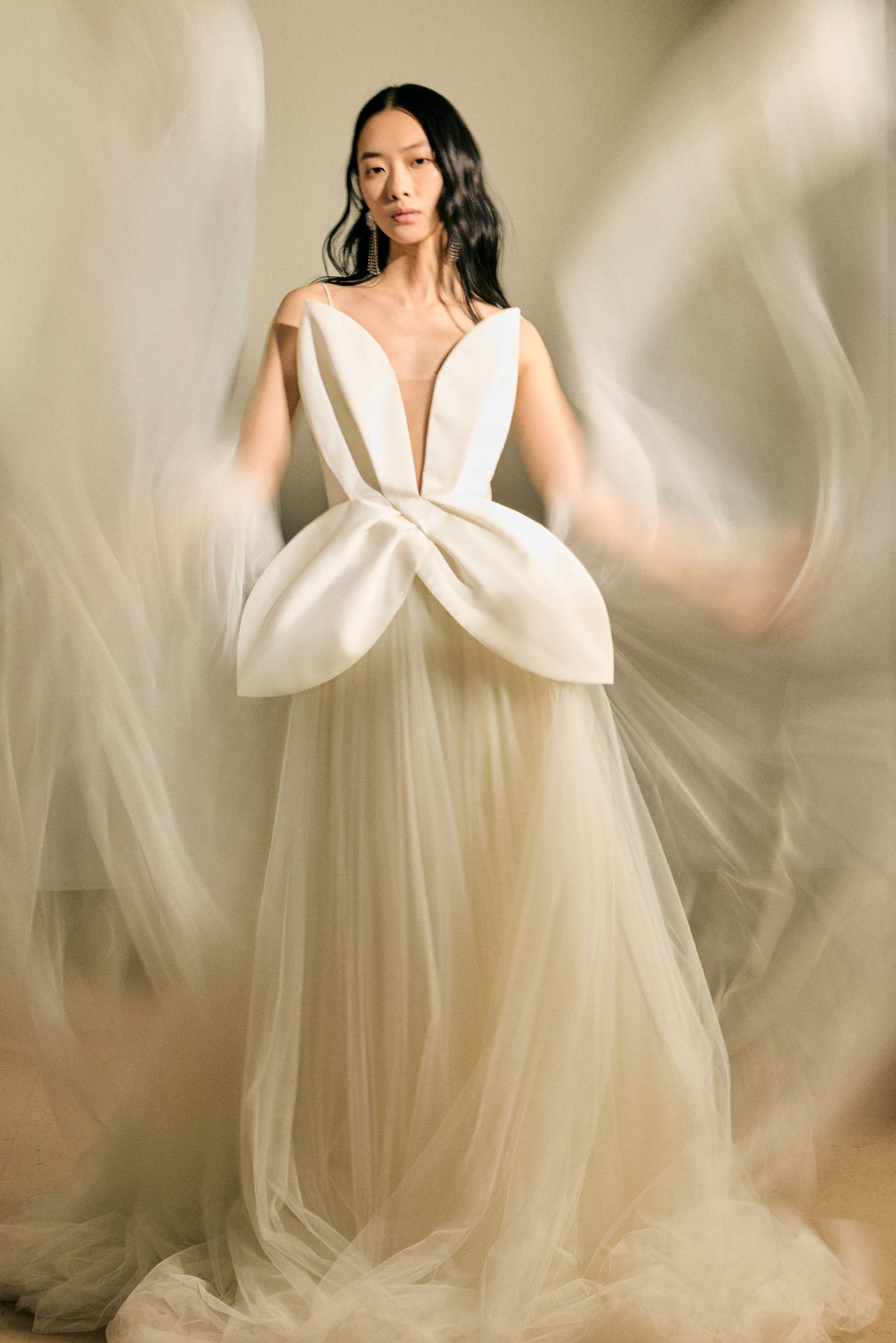 Eine Hochzeitskorsage mit übergroßer Vierblüten-Blüte, die das Herzstück des Looks bildet und die Essenz der Kollektion symbolisiert: die Harmonie zwischen Stärke und Anmut. Sie lässt sich sowohl zu einem voluminösen Rock als auch zu eleganten Marlene-Hosen kombinieren.