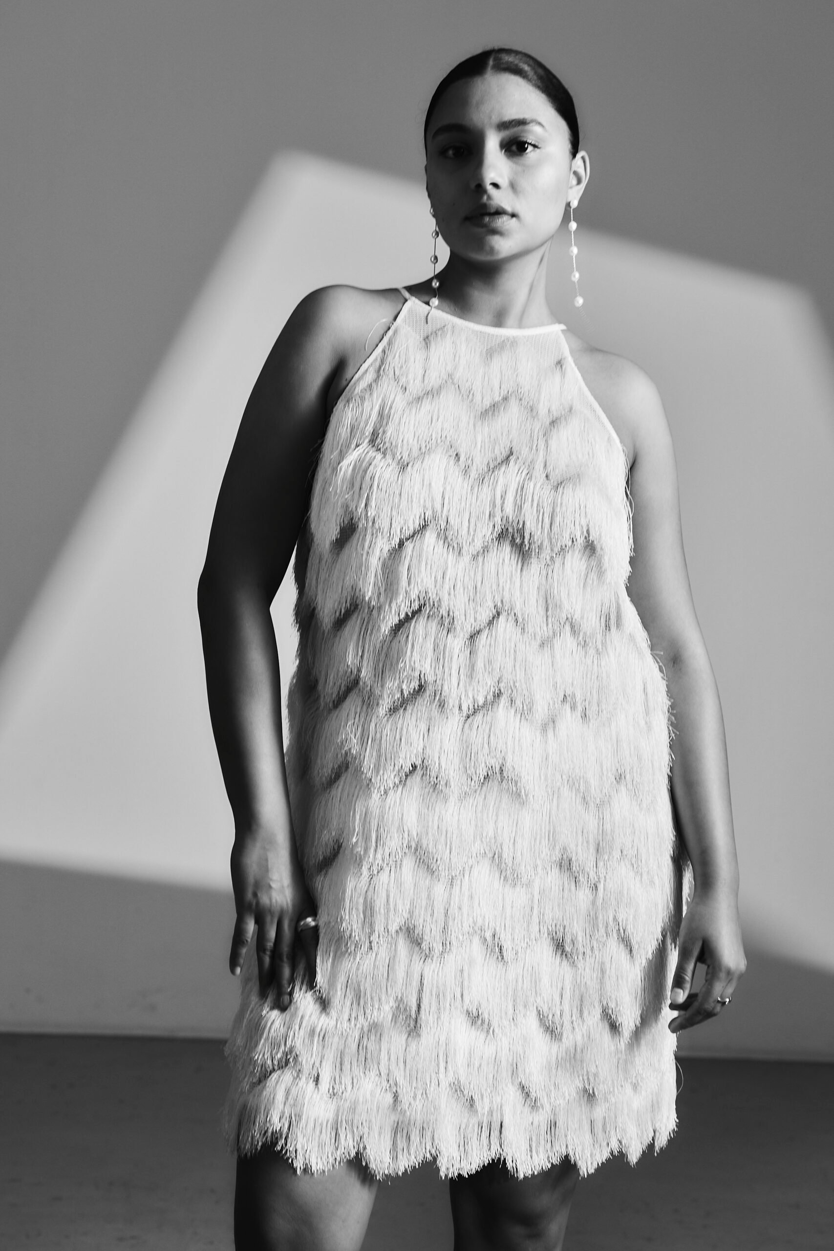 Daphne wearing the Edgy 7/8 Dress and Wedding Scarf small Daphne in the Twist Dress Mini Daphne in the Rosebud Dream Dress and Floral Veil