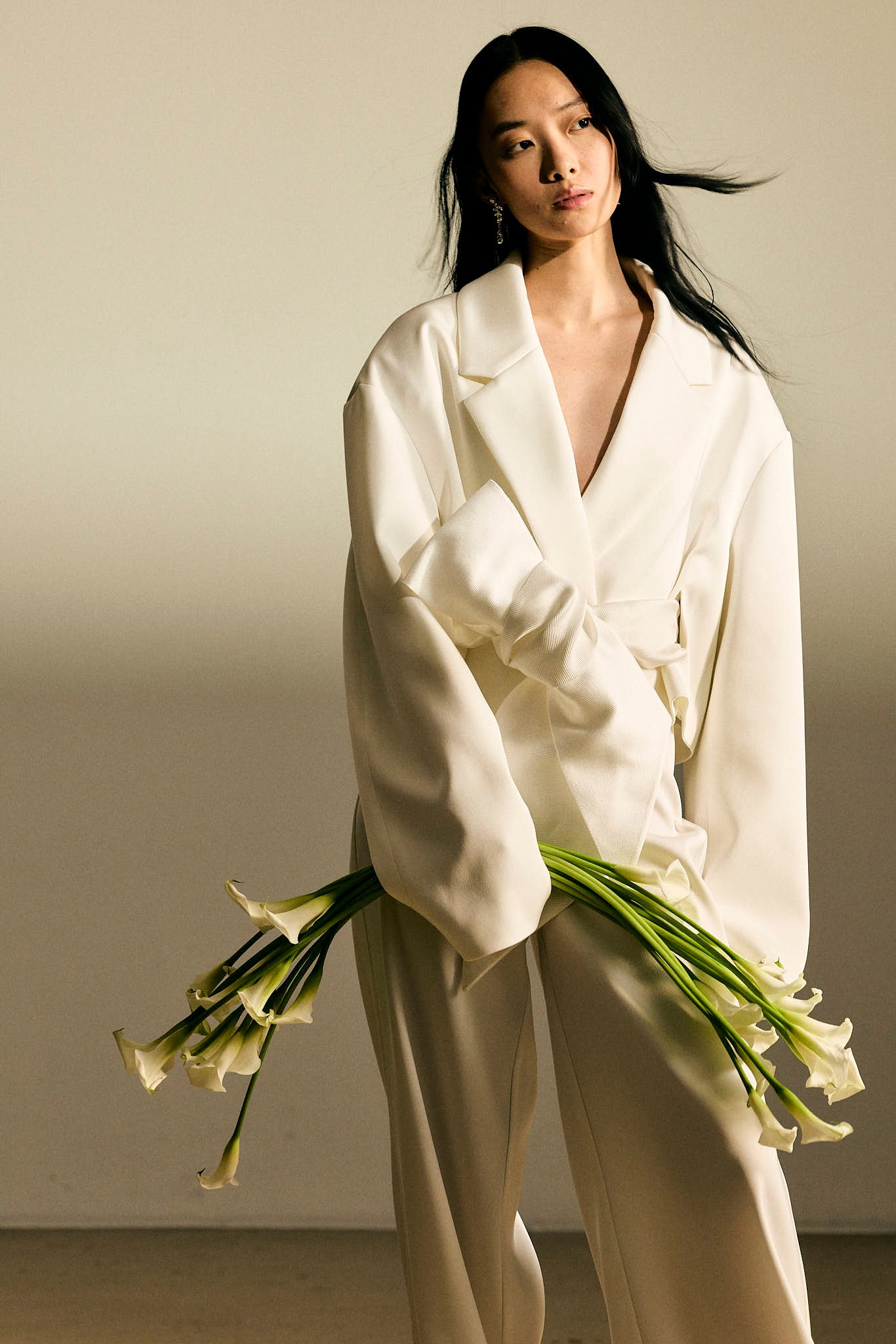 This cropped oversized wedding blazer combines modern ease with feminine flair. The wide belt can be tied into a bow, creating a chic, flattering silhouette, while the relaxed fit adds effortless style. Made from a softly shimmering blend of triacetate and polyester with a smooth viscose lining, it feels as luxurious as it looks.